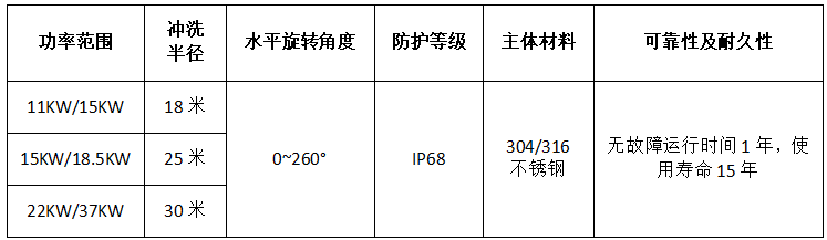 旋轉(zhuǎn)驅(qū)動(dòng)器及噴射水泵均采用國(guó)內(nèi)外知名品牌,產(chǎn)品本身采用不銹鋼材質(zhì)的材質(zhì)和精湛的制造工藝,耐腐蝕,使用壽命長(zhǎng)確保裝置在惡劣工作環(huán)境下長(zhǎng)期穩(wěn)定運(yùn)行,減少維修和更換成本。,IP68的防護(hù)等級(jí),性能好,耐用可靠。