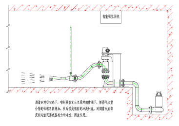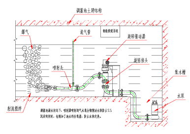 當(dāng)蓄水池內(nèi)有一定深度的水體時(shí),智能噴射器在控制系統(tǒng)的控制下,按照設(shè)定的程序,在0~260°范圍內(nèi)定時(shí)、定量、定向地往復(fù)擺動(dòng),通過產(chǎn)生的氣液混合物對(duì)調(diào)蓄池內(nèi)地水體進(jìn)行噴射曝氣,不但降解水中的COD含量,還加速池內(nèi)污水的氧化清潔,進(jìn)而最大限度地避免調(diào)蓄池產(chǎn)生異味。同時(shí),噴射的氣水混合物對(duì)池體具有攪拌作用,使池底的沉積物處于懸浮狀態(tài),利于潛污泵抽排懸浮狀態(tài)的污水,可以大幅減少池底淤積物產(chǎn)生(如圖1所示)。